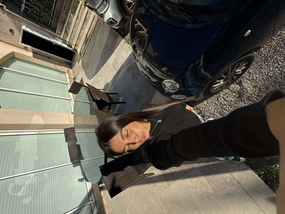 An overhead-angle selfie captures a young female subject outdoors in a courtyard in Antibes, France. The female, with long dark hair, is wearing a black long-sleeved top and light-colored pants, and a silver cross necklace. She has her eyes closed and lips pursed in a "kissing" gesture while holding a camera or phone at arm's length. The foreground features light-colored paved tiles. To the left, an oval glass-top table with six dark wicker-style chairs is arranged on the paving, positioned in front of a building facade with large glass doors covered by horizontal blinds. To the right, a dark-colored car with circular headlights is parked on a gravel surface, partially obscuring a light gray SUV behind it. Further right, a set of outdoor stairs with a metal railing ascends to a dark doorway. Strong sunlight casts prominent shadows across the scene.