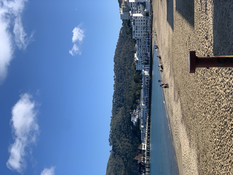 This image depicts a coastal scene in M'diq, Morocco, under clear daylight conditions. The foreground consists of a sandy beach, occupying approximately the bottom half of the frame. In the bottom right corner, a reddish-brown cylindrical post with a flat top is partially visible, showing green markings near its base. The sand bears visible footprints and textures. In the midground, the sandy beach meets the calm, blue-green water of a bay. Approximately 10-15 individuals are present on the beach. Two persons stand near the waterline on the left side of the midground. To their right, a small group of 3-4 individuals are seated on the sand, utilizing chairs or similar objects. Further along the curved shoreline, additional small groups or solitary figures are discernible closer to the water. The background features a built environment and a natural landscape. A pier extends from the left into the bay, culminating in a large building characterized by a multi-tiered, dark brown roof. Along the coastline, a series of white, multi-story buildings with blue architectural accents line the bay, stretching towards the right. These structures appear to be hotels or residential buildings. Behind and to the right of these coastal buildings, more white structures ascend a hillside. Dominating the distant background is a densely forested mountain range, rising behind the urban development. The sky is a bright, clear blue with several scattered white cumulus clouds present across the upper portion of the frame.