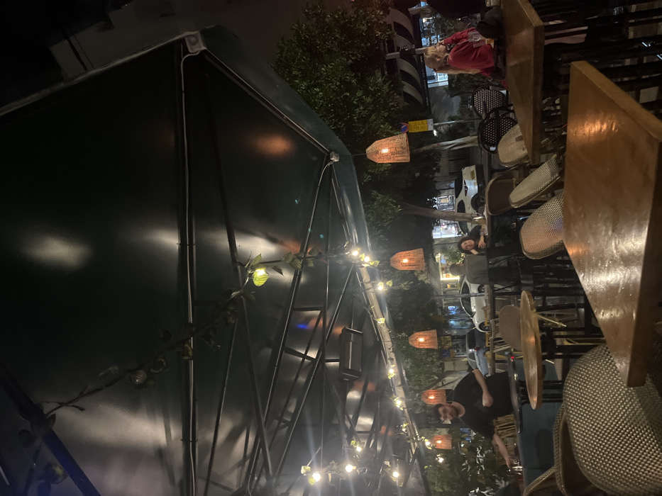 - "An outdoor dining area at night is depicted, located under an expansive dark green retractable awning supported by a metallic frame" by FM-3jBRA3, licensed under CC BY 4.0