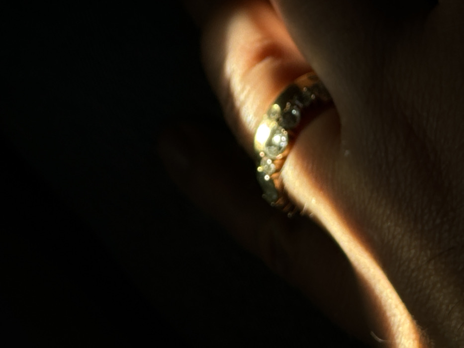 close-up of a person's hand wearing a gold ring with diamonds. The ring is on the index finger. The hand is in a relaxed position, with the palm facing upwards. The scene is lit by a single source of light, which is coming from the left side of the frame, casting a shadow across the hand and creating a strong contrast. The background is completely black. This image was taken in Fermo, Italy, at the coordinates (45.627, 8.715), which is the location of the town of Fermo in Italy.