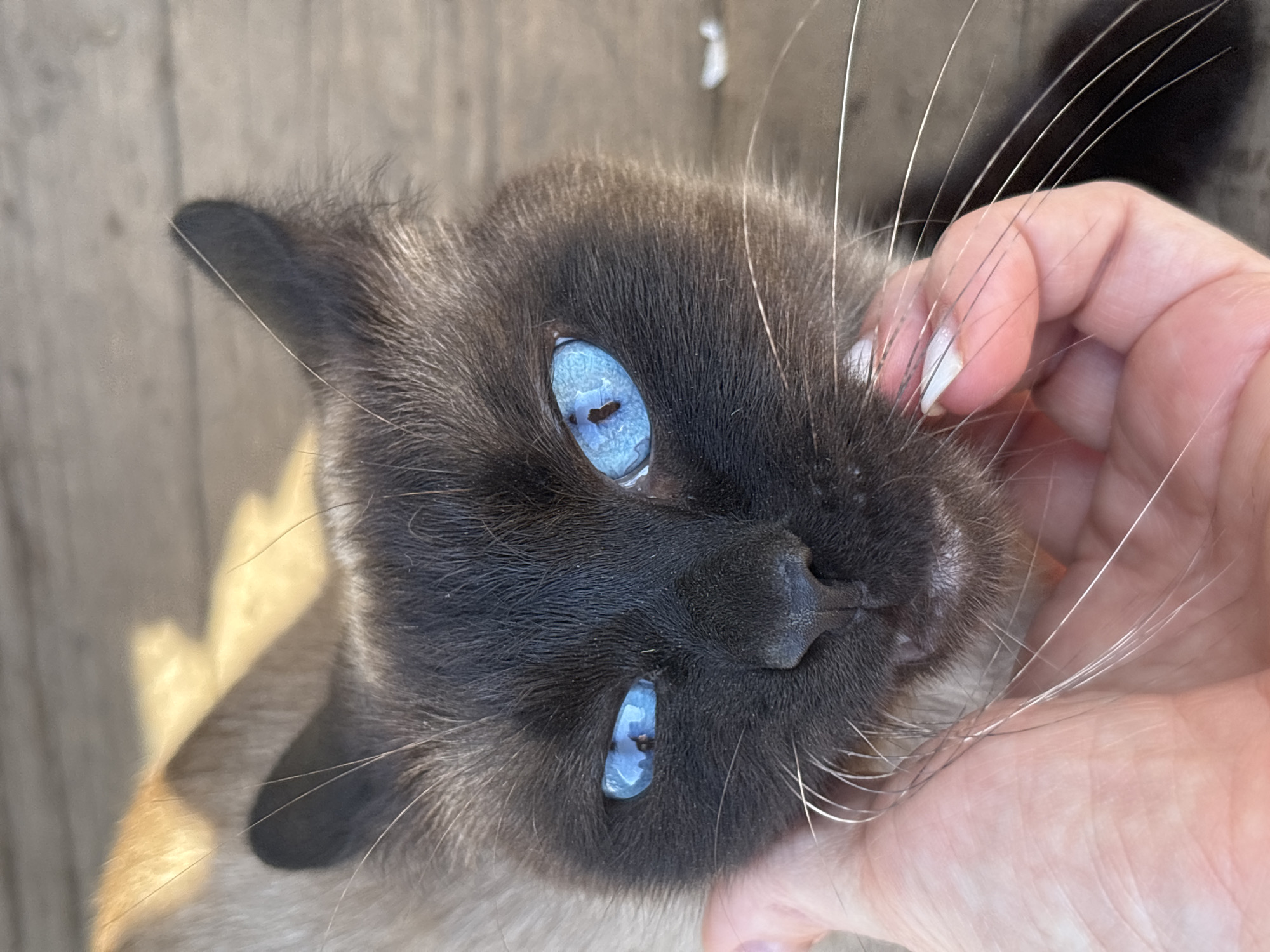 A close-up, slightly tilted image shows a Siamese cat's face being gently held by a human hand
