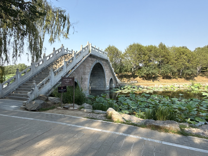 A stone bridge arches over a pond filled with lily pads under a clear blue sky. The bridge features steps and decorative railings, with foliage draping from its side. Lush green trees line the pond's edge. A paved path runs along the foreground, alongside the water. A small sign stands near the bridge, hinting at its historic nature.