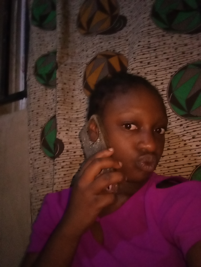 A young woman holds a phone to her ear, puckering her lips toward the camera. She wears a bright pink top. Her hair is pulled back. The phone case appears to be clear with glitter. Behind her is a patterned curtain or wall covering with abstract shapes in shades of green, brown, and yellow on an off-white background. The scene is somewhat dimly lit.