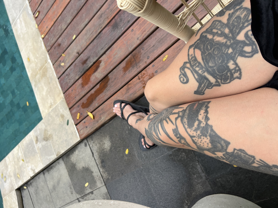 An overhead view captures a person's legs, adorned with dark tattoos, crossed while seated in a wicker chair. They are wearing black strappy sandals, and their feet are visible. The background features a poolside setting with wooden decking and gray tiled areas scattered with yellow leaves. Some water can be seen to the left.