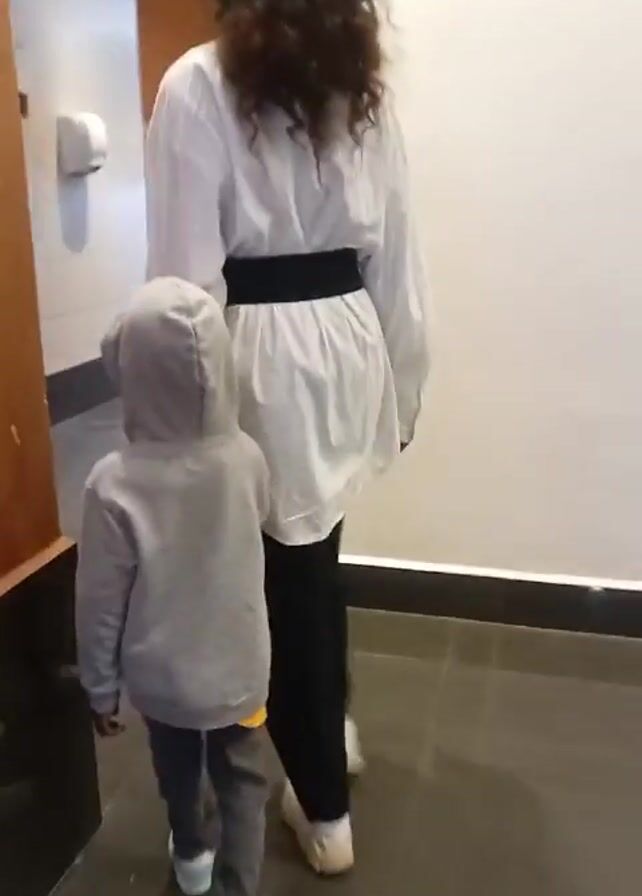 A child in a gray hooded jacket and jeans is walking beside an adult female with curly hair and wearing a white overshirt with a thick black belt, black pants, and white shoes. They are walking along a tile corridor with a dark floor. A doorway is visible to the left.