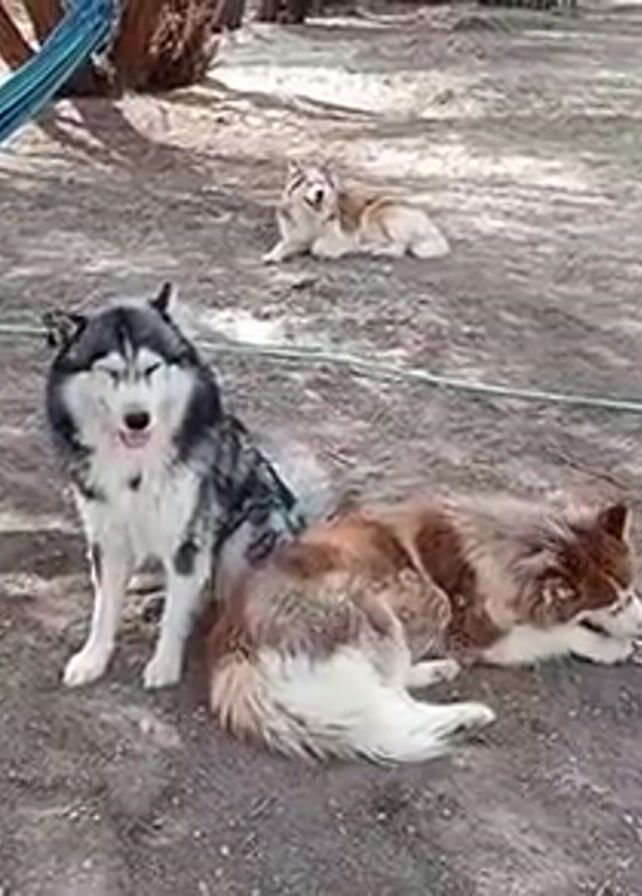 - "three husky dogs resting on a dirt ground outside, with a hammock slung between trees in the background" by FM-skUe82, licensed under CC BY 4.0