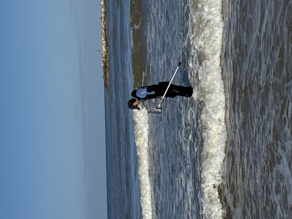 - "An adult male is observed standing in the shallow waters of the Mediterranean Sea, approximately waist-deep, actively engaged in metal detecting" by FM-La8Z13, licensed under CC BY 4.0