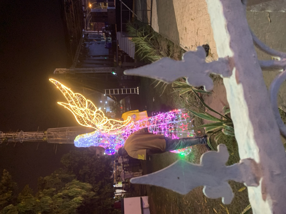 An illuminated angel-shaped light display stands on the ground. A person in a jacket and jeans stands near the angel. A white wrought iron fence is partially visible in the foreground. Behind the angel, a metal structure reaches toward the night sky. Trees and a building are visible in the background.