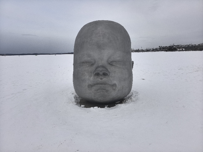 The image depicts a large, pale grey, smooth sculpture of an infant's head with closed eyes and a neutral expression, protruding from a flat, expansive layer of snow