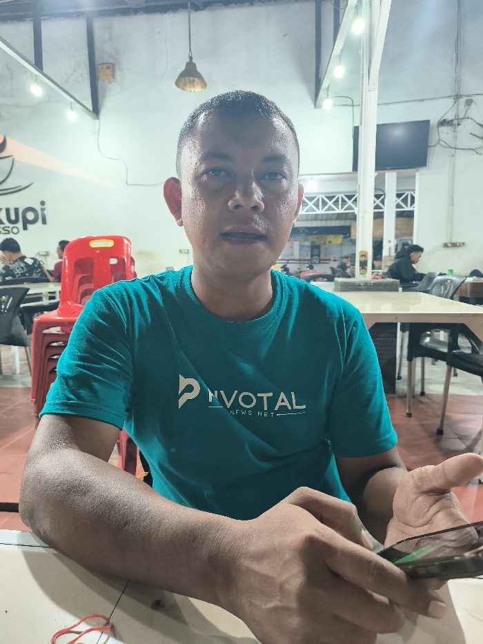 A man wearing a teal t-shirt with "PIVOTAL NEWS NET" printed on it sits at a table, holding a phone
