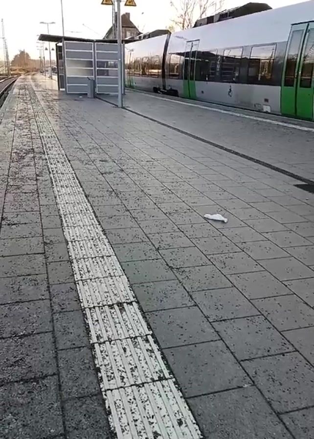 n empty train station platform. A modern train is stationary at the platform on the right. The platform is made of gray square tiles with a textured white line running parallel to the tracks. Overhead streetlights are visible on the left side of the platform. In the distance, behind the train station building, a few trees can be seen against the sky. A crumpled piece of white paper rests on the platform tiles. The lighting suggests either early morning or late afternoon.