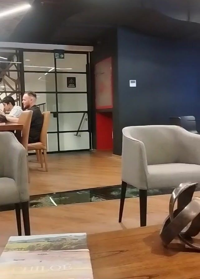 interior of a “Work Cafe Santander.” The camera pans to the right, starting from a low angle showing a book on a coffee table labeled “Chloé.” There are two gray armchairs in the foreground, then a table with two people sitting at it in the distance. A glass door with black trim is visible in the background, with a sign and an emergency exit symbol. The camera pans to the right to reveal a metal sculpture of interwoven circles on the coffee table, then to a book labeled "MAR DE CHILE". In the background, there are black tables and chairs with wooden legs. On the wall is a digital screen displaying information, and above it, the words "Work Cafe Santander" with a coffee cup logo. The flooring is a mix of wood and sections of glass with greenery underneath. The ceiling is black with recessed lighting.