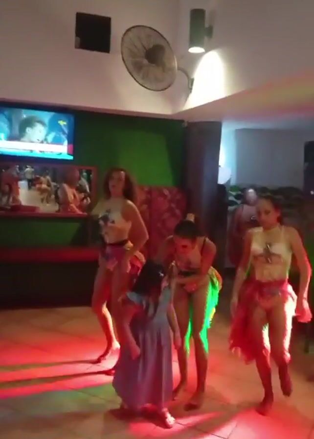 group of scantily clad dancers performing in what appears to be a bar or club. A young girl in a long blue dress is standing near the dancers, clapping along. There is a TV screen playing a broadcast in the background, and a ceiling fan is visible. The lighting in the room is predominantly red and green. Some people appear to be recording the performance with their phones. The floor is tiled with hexagonal tiles.