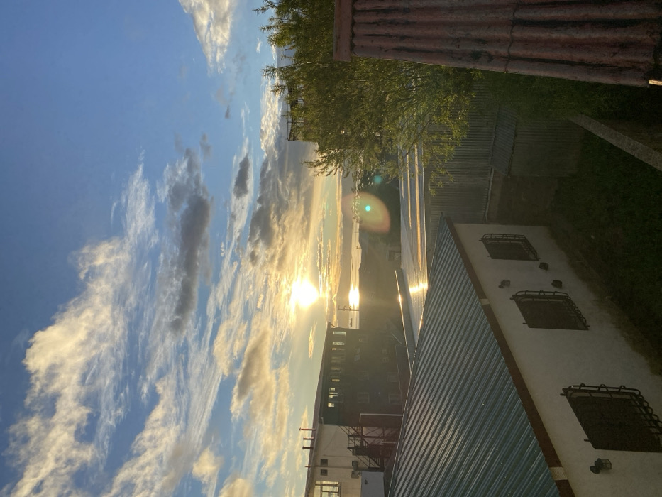 An elevated, static photograph captures a residential landscape in Ushuaia, Argentina, at either sunrise or sunset. The sky, a blend of clear blue and scattered altocumulus and cirrus clouds, transitions from light blue overhead to golden-orange hues near the horizon. The bright sun, positioned low above the horizon slightly left of center, casts intense light and a visible lens flare, reflecting off a calm body of water in the distance, presumably the Beagle Channel. In the foreground, a white single-story building with a dark green corrugated metal roof occupies the lower left. This building features three rectangular windows, each secured with black metal bars. A small, overgrown grassy yard lies immediately below this structure, bordered by a low concrete wall. To the lower right, a weathered, reddish-brown corrugated metal roof is partially visible, angled into the frame. The midground features various structures. Behind the white building, a corrugated metal fence encloses an area containing a small shed-like structure. Further back on the left, a multi-story building with a light-colored upper facade and darker lower sections shows an external black metal staircase. On the right, a deciduous tree with green foliage partially obscures another building topped with scaffolding. The background reveals the broad expanse of the Beagle Channel, shimmering with the sun's reflection. Beyond the water, distant mountain ranges or hills are silhouetted against the brightly lit sky. No people, overt actions, or interactions are present within the frame.