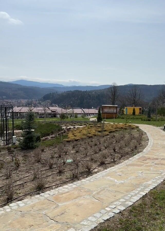 The camera pans from a stone pathway to reveal a view of a manicured park. The park has several small trees and a network of irrigation tubing. A gazebo, a small playground, and a pergola are visible in the distance. Beyond the park are a cluster of buildings and rolling, tree-covered hills under a bright, partly cloudy sky. The wind is blowing.