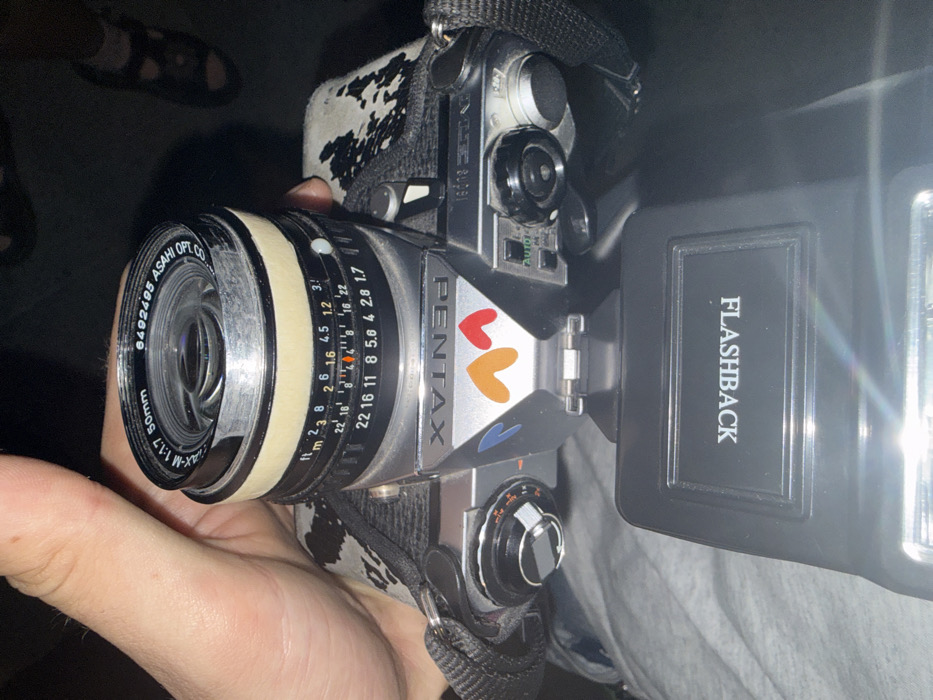 - "A close-up, top-down image depicts a vintage Pentax K-mount film camera with an attached flash unit, held by a person in low light conditions, situated in Tel Aviv, Israel" by FM-flOVp1, licensed under CC BY 4.0