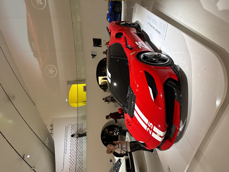 The image depicts the interior of the Museo Casa Enzo Ferrari in Modena, Italy