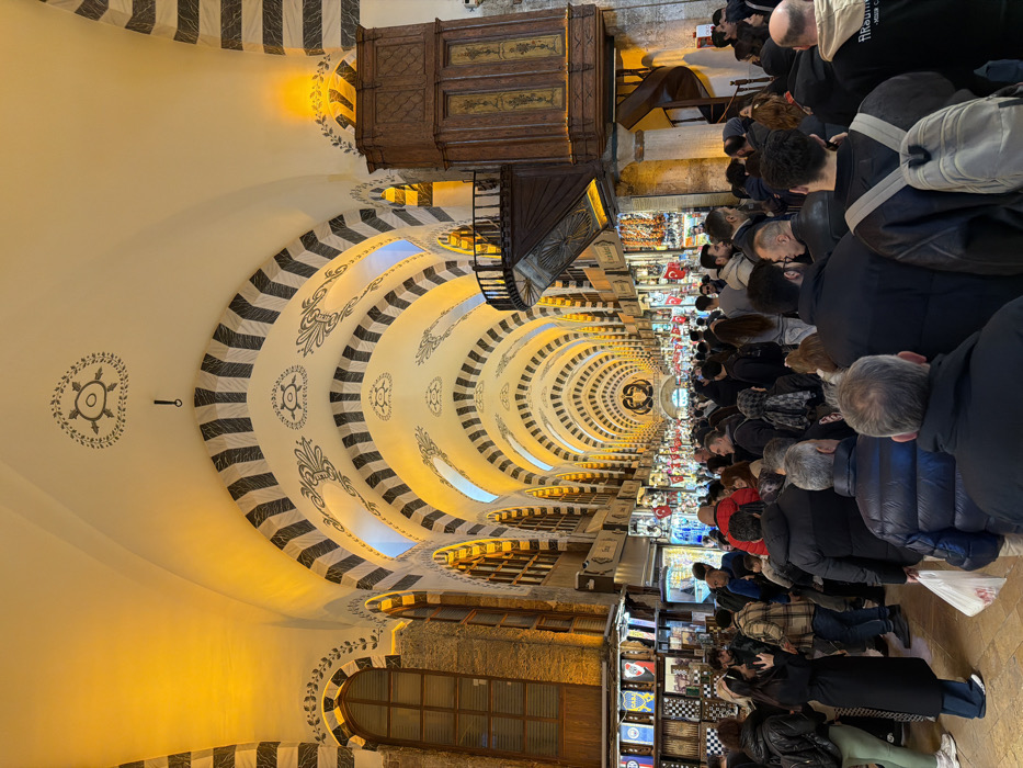 The image depicts a crowded, vaulted corridor within the Grand Bazaar (Kapalıçarşı) in Istanbul, Turkey. The scene is illuminated by warm artificial light highlighting the architectural details. The ceiling features a series of high, repeating arches with alternating dark and light striped patterns, extending into the distance. Each vaulted section is adorned with intricate circular and floral motifs in dark grey on a light, off-white background. On the left, a stone wall incorporates several large arched windows with wooden frames. On the right, a prominent ornate wooden structure, resembling an elevated booth or room, extends from the wall, complete with a small balustraded balcony and a dark wooden spiral staircase leading up to it. Below the architecture, the main aisle is densely populated with a large, diverse crowd of people, predominantly adults, moving in various directions. Most individuals are dressed in casual, layered clothing, including jackets and coats. Numerous shop stalls line both sides of the corridor, displaying a variety of merchandise such as decorative plates, checkered boards, and other colorful goods under bright shop lighting. Several small Turkish flags are visible hanging from the stalls further down the bustling passage. One individual in the foreground on the left carries a white plastic shopping bag.