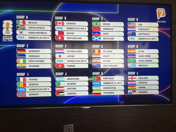 The image displays a simulated FIFA World Cup 2026 final draw. Twelve groups (A-L) are presented, each containing four teams. Group A includes Mexico, South Africa, Korea Republic, and a FIFA Play-Off Winner. Group B contains Canada, Qatar, Switzerland, and another FIFA Play-Off Winner. Other notable teams include Brazil, USA, Germany, Netherlands, France, Argentina, Portugal, and England. The broadcast logo is visible in the top right corner.