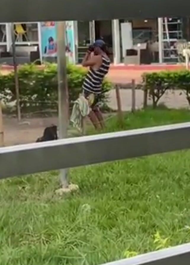 man in a park. He is wearing a blue baseball cap, a striped tank top, and patterned shorts. He is standing next to a pole and appears to be talking on a cell phone. Behind him is a building with the name "Casa Bonita" on it. There is a small patch of grass and some bushes around the pole. A black bag is on the ground near the pole. The video is shot through a fence.