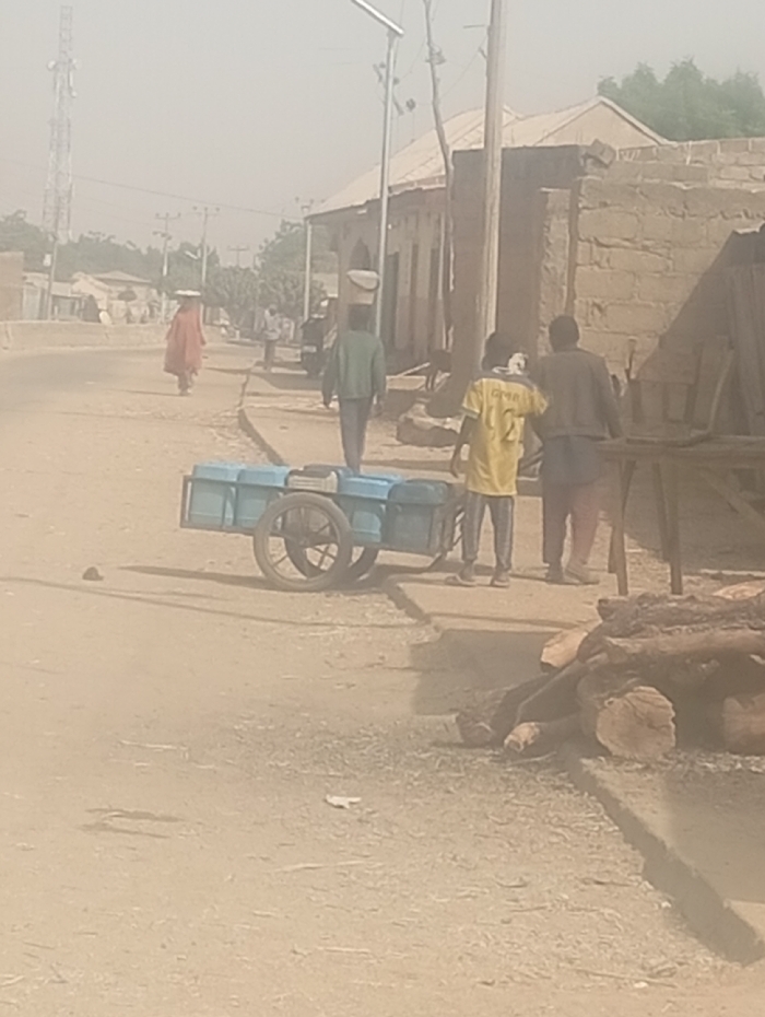 The scene depicts a dusty, unpaved road in Sumaila, Nigeria, under hazy daylight conditions
