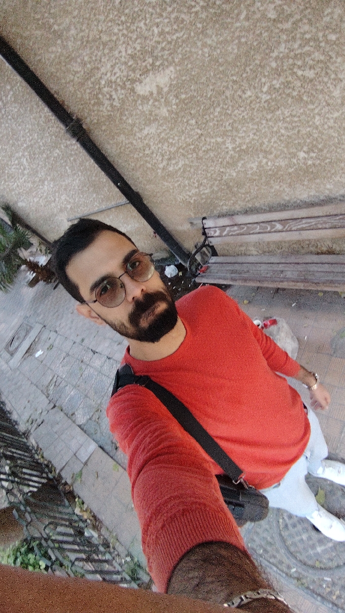 A man wearing a red sweater, light-colored jeans, and white shoes stands on a sidewalk. He has a beard and wears round, tinted glasses. A black shoulder bag is slung across his body. Overhead is a weathered awning with a dark metal support bar. A wooden bench sits behind him, littered with trash. The perspective suggests he's holding the camera, taking a selfie.