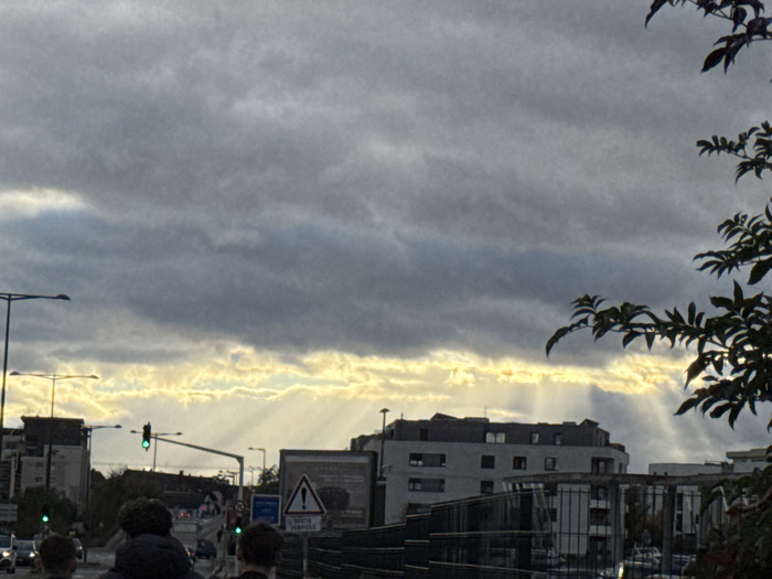The image depicts an urban landscape in Hoenheim, France, under a heavily overcast sky featuring a dramatic natural light phenomenon. Dark grey clouds dominate the upper and lower portions of the sky. A distinct horizontal band of bright, golden-yellow light cuts across the mid-horizon, from which multiple defined crepuscular rays (sunbeams) emanate downwards. In the lower central foreground, at least three individuals are visible from behind, their upper bodies silhouetted. To the left, a dark vertical street light pole is prominent. Further left, a road is visible with several partially obscured vehicles. Multiple other street light poles and at least two illuminated green traffic lights are present across the midground. Various multi-story buildings, including one light-colored structure on the far left and a modern building with numerous rectangular windows on the right, constitute the urban environment. Below the building on the right, a metallic fence-like structure is present. A white triangular warning sign with a red border and black text, partially visible but indicating "VOIE SURPRISE," is located in the midground to the right of center. In the upper right foreground, dark, silhouetted tree branches with leaves extend into the frame.