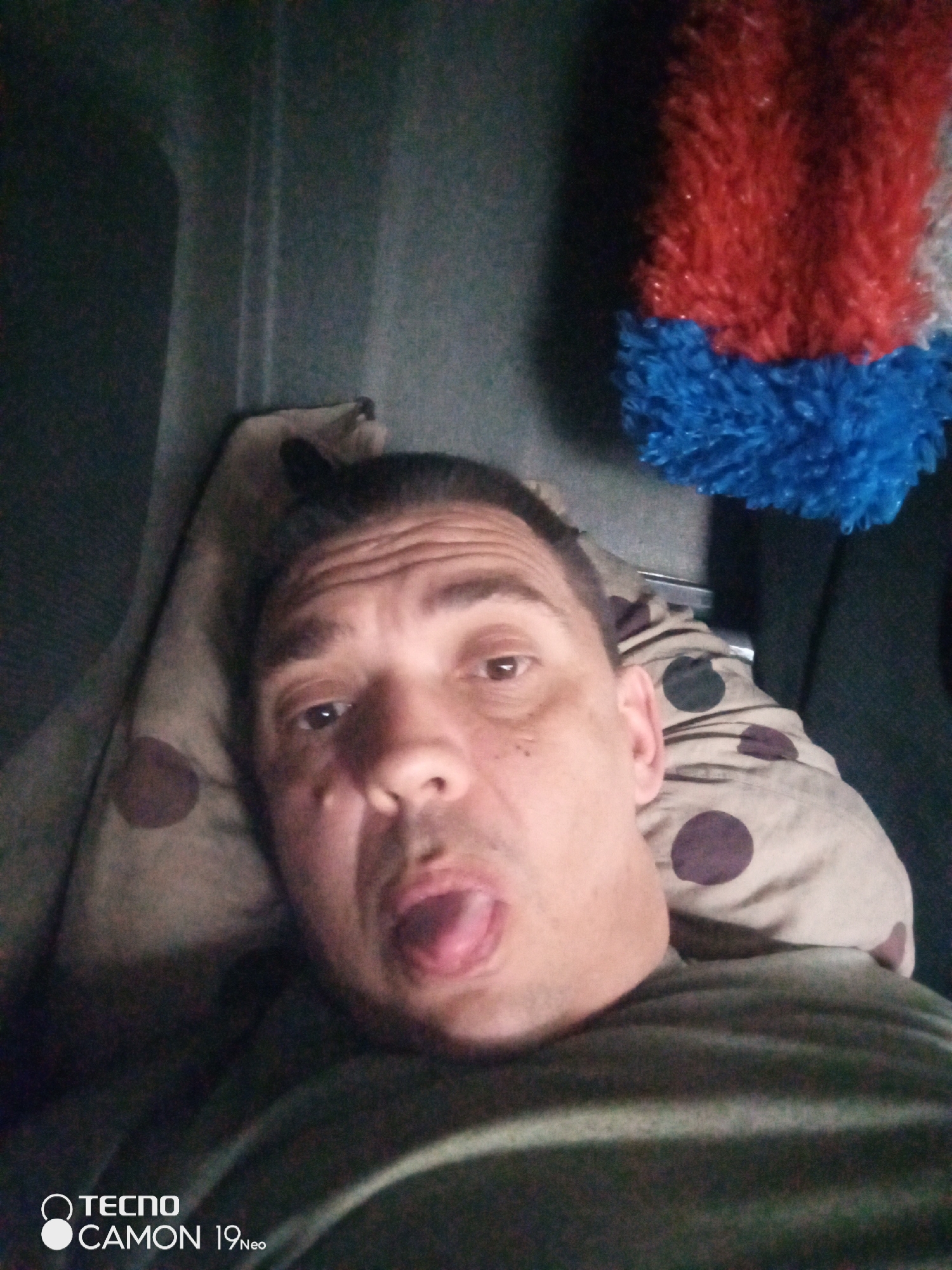 A middle-aged man is lying down, possibly in a bed or on a couch, sticking his tongue out. He is resting on a pillow with brown polka dots. A fuzzy red and blue object is hanging in the background. The location is unknown, and there is no evidence to suggest that the scene is in Ufa, Russia.