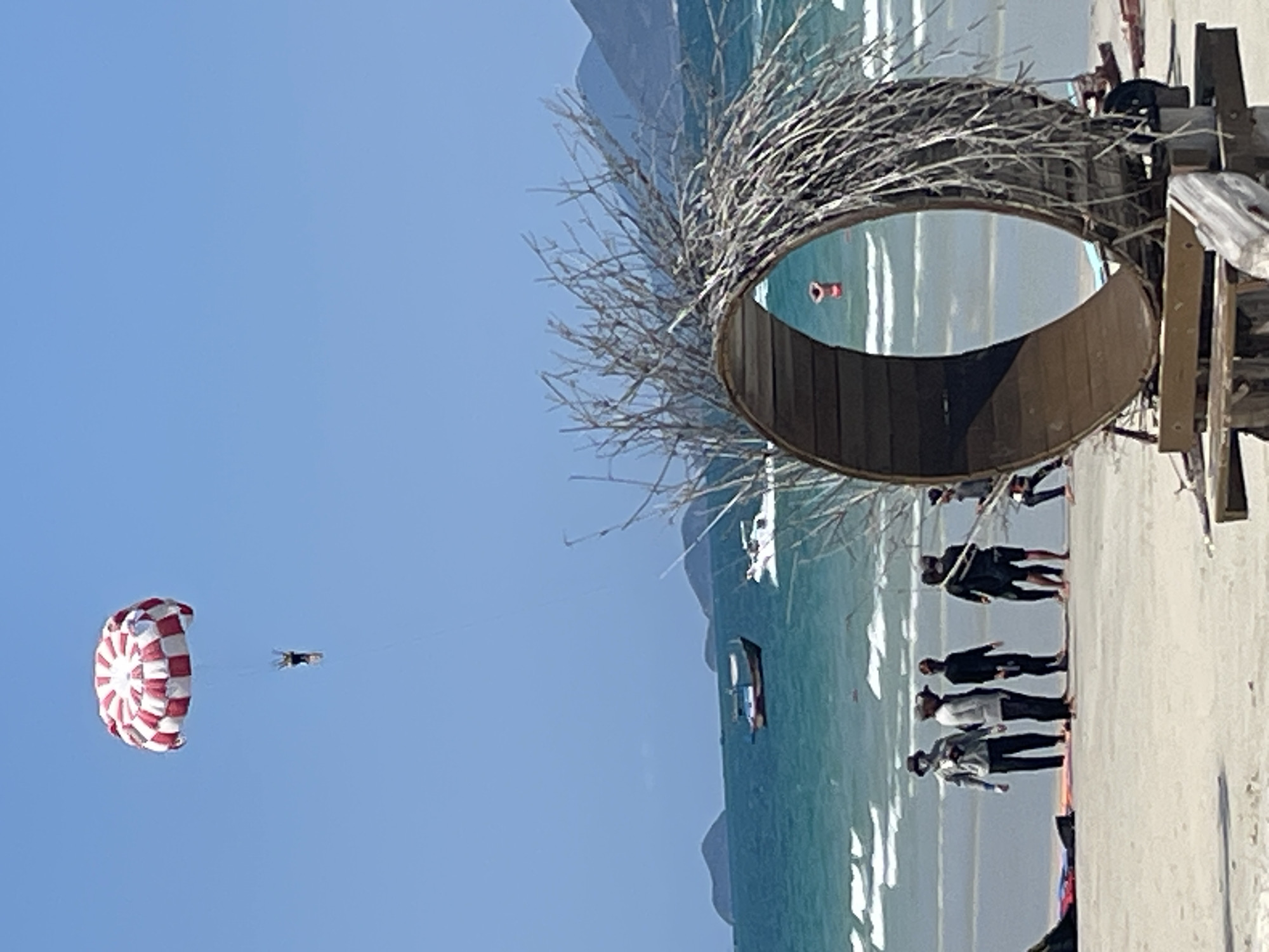 The image depicts a coastal scene near Dong Ninh Hoa, Vietnam. The landscape features a beach, turquoise ocean, and distant mountains under a clear blue sky. In the foreground, a wooden structure resembling a bird's nest is prominently positioned, acting as a frame for a view of the ocean. A group of people are visible standing on the beach near the structure. In the sky, a parasail with a red and white parachute is in flight, with a person attached. Boats are also present on the water.