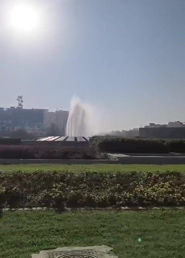 park with a large fountain in the center, shooting water high into the air. The sky is bright blue and the sun is shining intensely. In the background, there are several modern buildings. The park includes a grassy area, flower beds with various plants, and a paved walkway. The camera pans slightly to the right during the video.