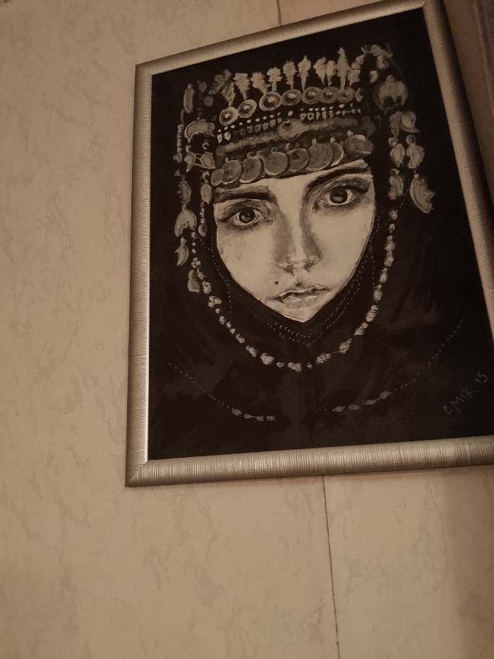 - "The framed painting depicts a woman in traditional attire, seemingly Middle Eastern, adorned with a heavy headdress of coins and embellishments" by FM-q5MXq2, licensed under CC BY 4.0