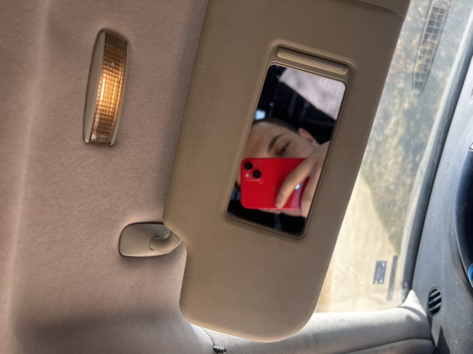 The image displays the interior of a vehicle, in Verinsko, Bulgaria, focusing on a beige fabric sun visor. The sun visor, partially lowered from the vehicle's beige fabric headliner, contains a rectangular vanity mirror. Reflected within this mirror is the upper portion of a male individual's face, specifically his eyes and forehead, along with his right hand holding a red smartphone. The smartphone, featuring two prominent rear camera lenses, is directed towards the mirror, indicating the individual is capturing an image of his reflection. Above the sun visor, a beige plastic clip secures the visor, and an amber-colored rectangular overhead interior light fixture is visible on the headliner. The lower section of the image reveals the top of the vehicle's dashboard and the windshield, through which a blurred outdoor environment with sunlit ground is discernible, consistent with daytime conditions. No other individuals or significant actions are present.