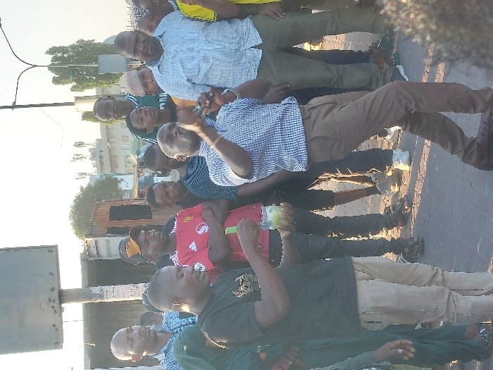A group of approximately twelve men stand close together outdoors. Several wear casual clothing like t-shirts and jeans, while others are dressed in collared shirts and trousers. One man holds what appears to be a glass of liquid. The scene appears to be a gathering or informal meeting, possibly on a street or sidewalk. A few buildings are visible in the background, along with street lights. The photo is rotated slightly counter-clockwise.