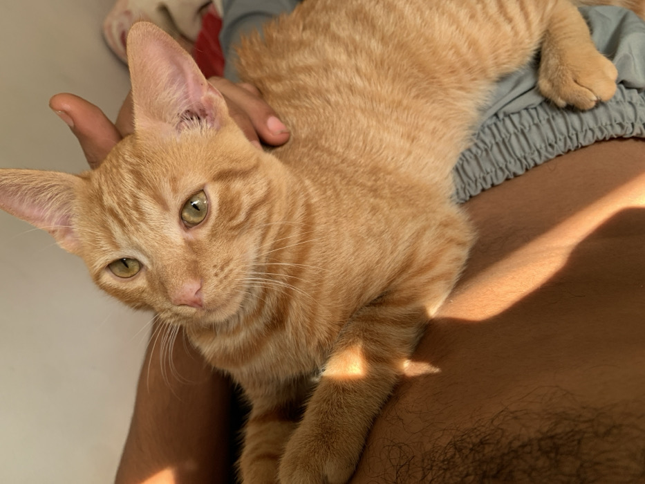 - "This image depicts a close-up indoor scene in M'diq, Morocco, featuring an orange tabby cat resting on a human's upper leg" by FM-db0142, licensed under CC BY 4.0