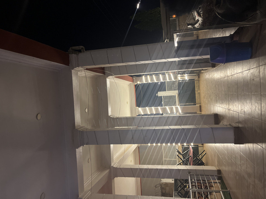 An upward perspective reveals a multi-story building facade at night, illuminated by strings of lights tracing the structure's edges. Rectangular columns frame receding floors, with tiled ground visible at the top. A blue bucket sits in the corner. Metal railings and dark, folded chairs are on the ground level. The left side of the image shows a white wall with circular vents and a maroon edge.