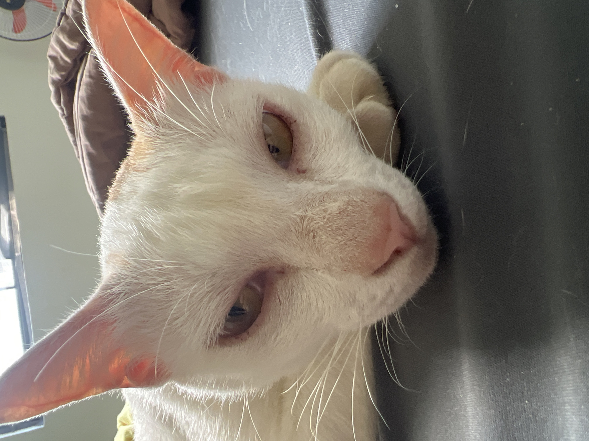 A white cat, exhibiting light orange fur markings on its head and ears, is depicted lying on a dark gray fabric surface, consistent with a bed, in Cam Đức, Vietnam. The cat's head is centrally framed, with its yellow-amber eyes appearing slightly narrowed and its pink nose prominently visible. Its left front paw is tucked beneath its head. In the blurred background, a brown rumpled blanket is present, along with a partial view of a white electric fan featuring orange blades on the right. Natural light from a window illuminates the scene from above.