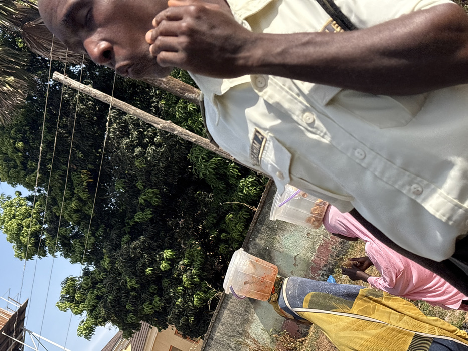 The scene is set in Tataura, Nigeria, under bright daylight. In the foreground, positioned to the right, an adult male with dark skin is visible from the chest upwards. He wears a light-colored, short-sleeved collared shirt with a patch on the right shoulder bearing text resembling "TAWURMA." His lips are pursed, and his right hand is raised towards his chin. In the mid-ground, to the left, two individuals are partially visible. The first, further back, wears a blue garment with a yellow pattern and has a clear plastic bucket, tinged orange-red, balanced on her head. The second individual, closer to the foreground male, wears a pink garment and has a clear plastic bucket containing light brown items balanced on her head. Both buckets have white lids. Behind these individuals is a light grey concrete wall. Beyond the wall, several large green leafy trees are prominent, and a building with a reddish-brown tiled roof is partially visible to the far left. Overhead, a clear blue sky is crisscrossed by several thin wires, and a wooden utility pole stands vertically. The ground appears dry and earthy.