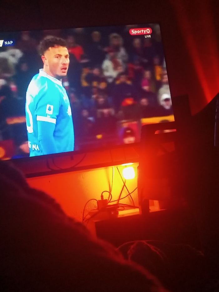 A person is watching a soccer game on a TV, which displays a player in a light blue jersey with the number 10. "Sporty TV LIVE" is visible in the top right corner. The TV is on a stand, and below it, there's a lamp casting an orange glow. Cords and devices are visible near the lamp. The room appears dimly lit, and the lower portion of the frame shows a blurred leg of the person watching TV.