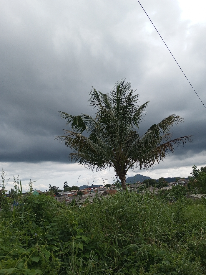 The scene is located in Ganja City, Azerbaijan. The image depicts an outdoor environment under a heavily overcast sky, filled with dark and lighter grey clouds. In the foreground, dense, unkempt green vegetation, including various grasses and broadleaf plants, occupies the lower portion of the frame. A mature palm tree, consistent with a coconut palm, stands prominently in the mid-ground, featuring numerous green fronds, some with browned tips. Behind the tree and foreground growth, a sprawling residential area is visible, composed of multiple low-rise buildings with diverse roof colors. A small mountain or hill rises in the distant background, slightly to the right of center. A single dark utility wire is present in the upper right sky. No people, actions, or specific interactions are visible.