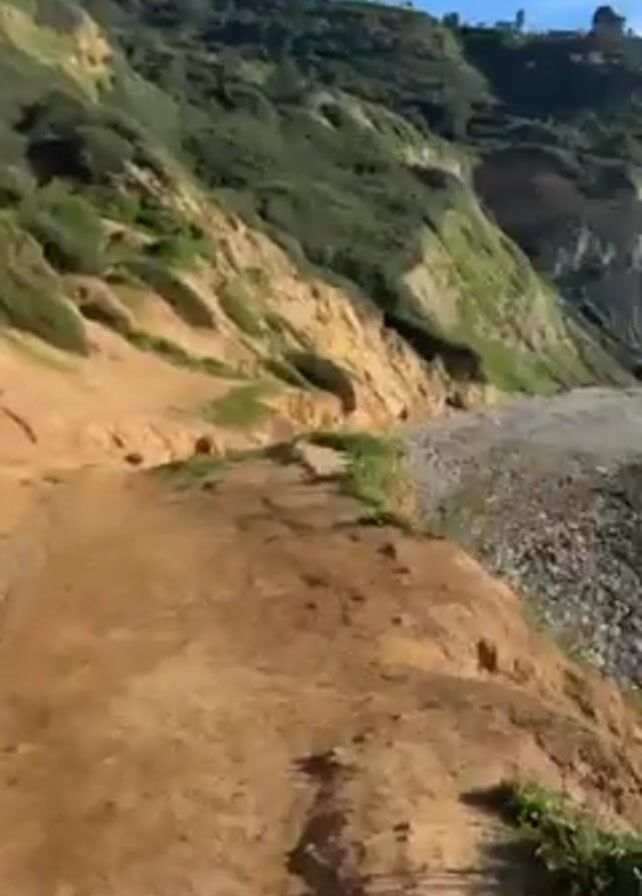 young woman in a white tank top and black shorts standing on a sandy path overlooking a rocky beach. She is holding something in her hand and looking at the camera, and there are other people further down the path behind her. The camera then pans to show a coastline with a rocky beach and a grassy hillside. The camera then pans again to show a view of the ocean with a cliff in the distance, with the sun shining brightly in the sky.