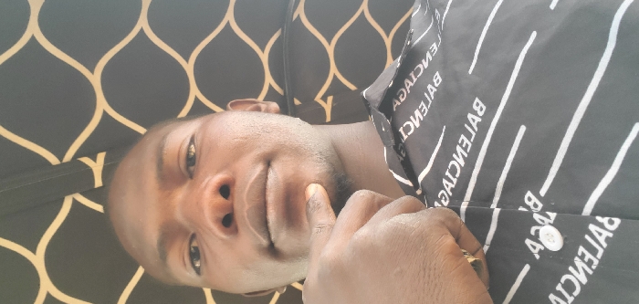 A man is lying down, looking up at the camera. He has dark skin, short dark hair, and a small goatee. His left hand is touching his cheek. He is wearing a black and white shirt with the word "Balenciaga" printed repeatedly. The background includes a black surface patterned with gold ogee shapes. The photo appears to be taken indoors.