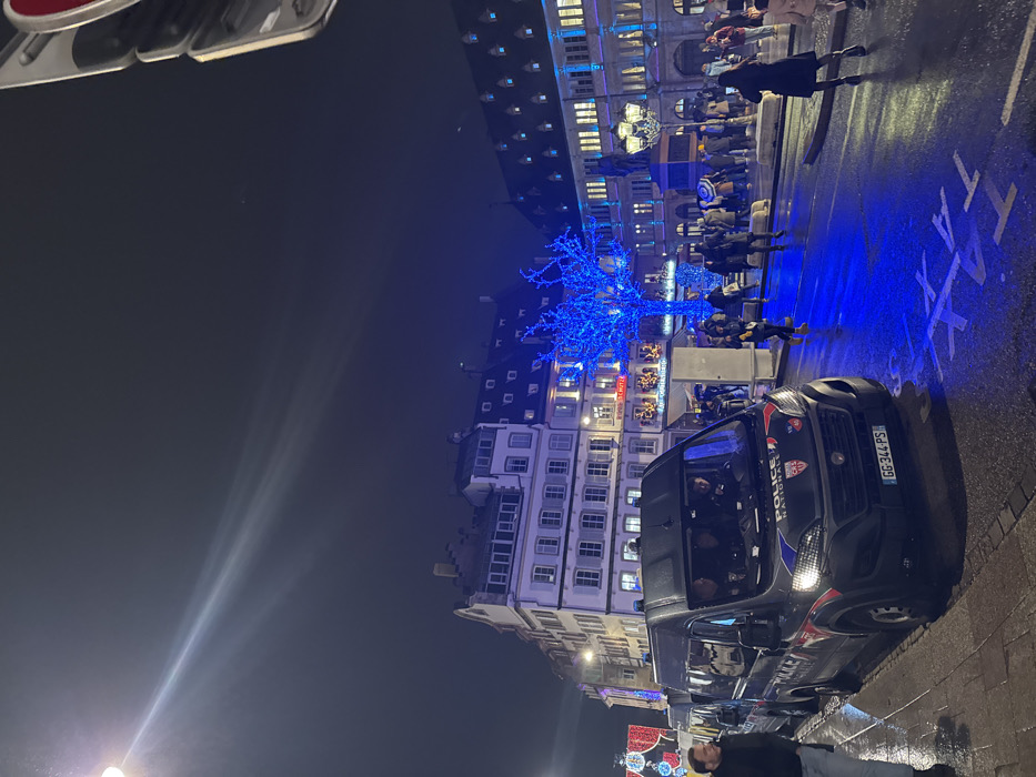 At night, a black police van with blue lights sits on a wet street. A man lies on the sidewalk near the vehicle. Across the street, a crowd gathers near a building with illuminated windows and a blue-lit tree. The pavement reflects the lights, creating a shimmering effect. The scene suggests an urban environment at night, possibly during a festive or public event.