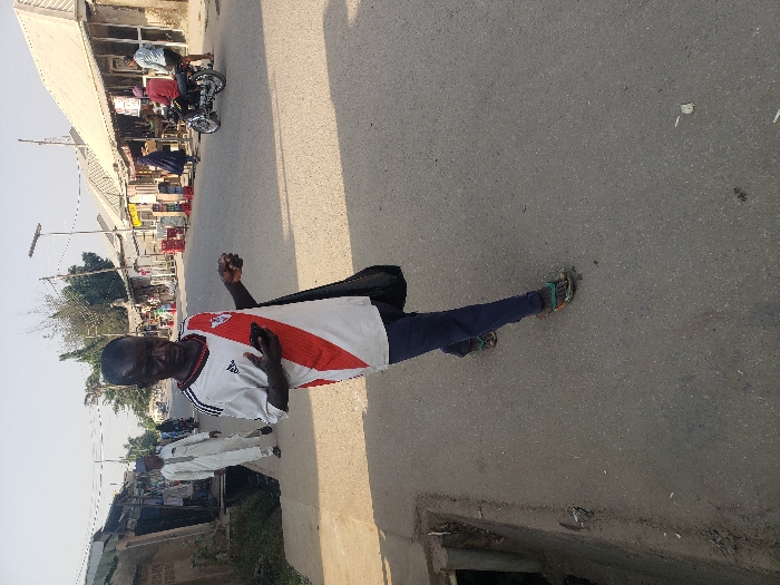 The image depicts a daytime street scene in Suleja, Nigeria. A male individual of dark complexion, appearing to be middle-aged, is the primary subject in the foreground, walking from the viewer's left towards the right, slightly angled towards the camera. He wears a white short-sleeve shirt with a diagonal red stripe across the chest and a black adidas logo, dark blue trousers, and green and black flip-flops. His left hand holds a black smartphone, with his gaze directed downwards at the screen. A black bag with a shoulder strap hangs over his left shoulder. His right hand is loosely open. The setting is an urban street, likely a commercial area. The asphalt road shows signs of wear and minor debris. Along the left side of the road, a concrete drainage ditch runs parallel to a raised concrete sidewalk. Beyond the sidewalk are one-story buildings with corrugated metal roofs, suggesting shops or residential structures. Merchandise, including clothing, is visible hanging outside one of these buildings. Further down the street on the left, another male in a white traditional robe (agbada) walks away from the camera. On the right side of the road, similar one-story buildings with corrugated metal roofs line the street, appearing to be shops with various items displayed, including stacked crates of beverages. Several individuals are present in this area; one person in a dark blue garment stands near a shop, and another individual is seated on a black motorcycle, which is stationary or moving slowly. A solar-powered street light is mounted on a pole in the background. Utility wires are visible overhead against a clear, light blue sky. The scene is illuminated by natural sunlight, casting subtle shadows.