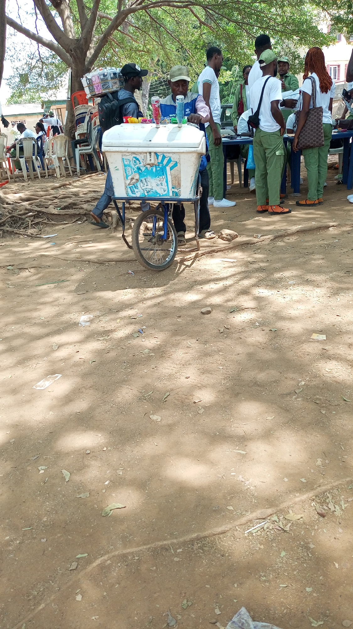 The image depicts an outdoor gathering in an unpaved, dusty area in Abuja, Nigeria, under the shade of mature trees with prominent exposed roots. Approximately 15-20 individuals are visible. In the central foreground, an older male vendor, wearing a blue and white long-sleeved shirt and a light-colored cap, stands behind a white, two-wheeled vendor cart with blue graphics on its side. A blue water bottle and two red-capped dispensers are positioned on top of the cart. To the vendor's immediate left, a younger male in a black cap and backpack carries a stack of small, packaged items on his head. In the mid-ground, several young adults are present, with multiple individuals distinctively dressed in the green trousers and white shirts characteristic of the National Youth Service Corps (NYSC) uniform. One female NYSC member with reddish-brown dreadlocks is seen from behind, carrying a brown patterned shoulder bag. Another male NYSC member wears orange-brown boots. This group is primarily standing, conversing near what appear to be blue tables. In the left background, white plastic chairs are arranged around tables, with a few individuals seated. A dark green vehicle is partially visible behind the group on the right. The ground is reddish-brown earth, marked by tree roots and scattered small pieces of litter. Bright sunlight filters through the tree canopy, casting distinct shadows. Simple, low-rise buildings with light-colored walls and corrugated roofs are visible in the distant background.