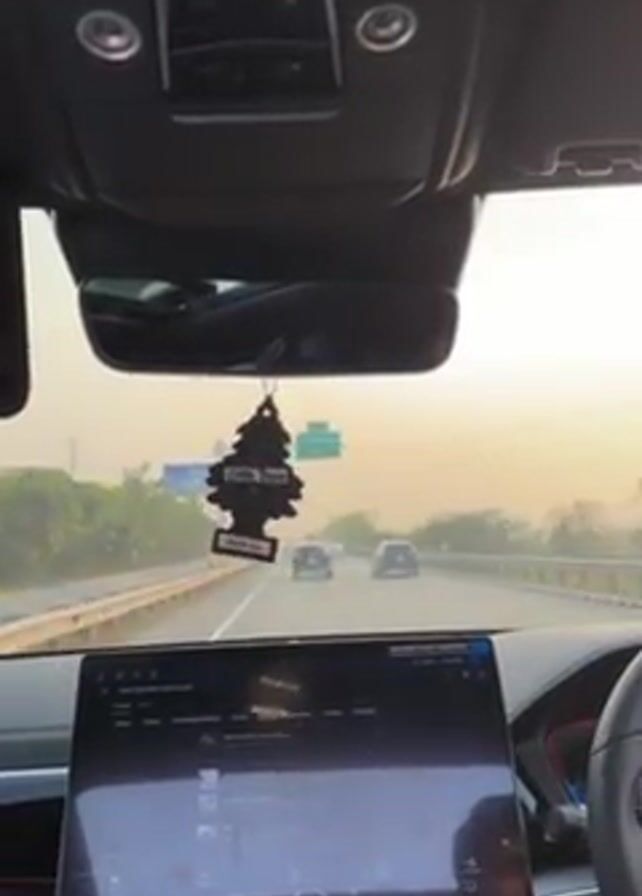 interior of a car driving on a highway. The car's dashboard features a large touchscreen display, and a "Little Trees" air freshener hangs from the rearview mirror. The road ahead has multiple lanes with a few other cars visible in the distance. The sky is overcast, creating a soft light, with trees lining the side of the road.