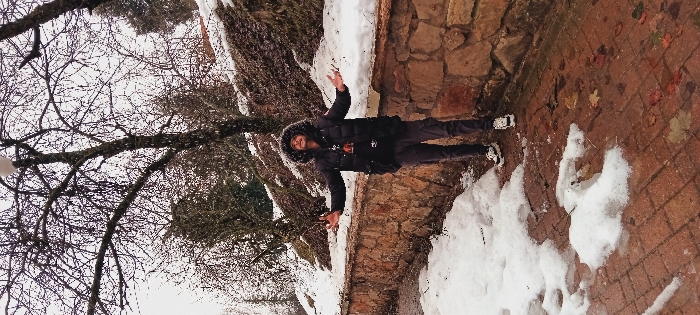 An outdoor scene in Ifrane, Morocco, depicts an adult male standing on a reddish-brown paved surface under an overcast sky. The individual is positioned centrally, wearing a dark puffer vest with a fur-lined hood pulled over his head, a dark long-sleeved shirt with a visible graphic, dark pants, and white sneakers with black accents. He stands with his arms outstretched and hands open, palms upward, while looking slightly upwards. To the man's left and extending behind him, patches of melting snow are present on the ground and on an elevated embankment beyond a low, stacked stone retaining wall. The embankment is populated by numerous bare deciduous trees and some darker evergreen foliage. A tall, leafless tree stands prominently in the background. The sky is uniformly white and overcast.