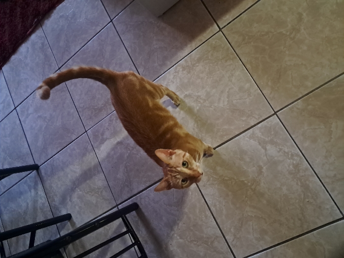 - "The image depicts an indoor scene in Mitchells Plain, South Africa, featuring a solitary orange tabby cat standing on a light-colored tiled floor" by FM-itX5C3, licensed under CC BY 4.0
