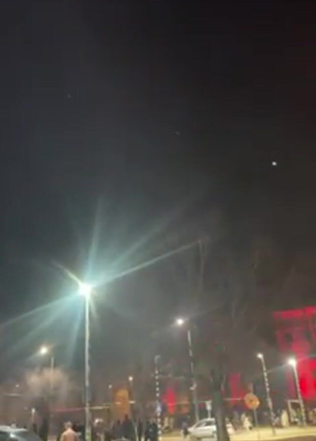 crowd of people standing on a street at night. Streetlights illuminate the area, creating bright points of light with starburst effects. Smoke drifts through the air, partially obscuring the background. Buildings with red lighting can be seen in the distance. Some cars are parked along the street. A couple of people stand in the foreground, partially blocking the view. The overall atmosphere suggests a public gathering or event.