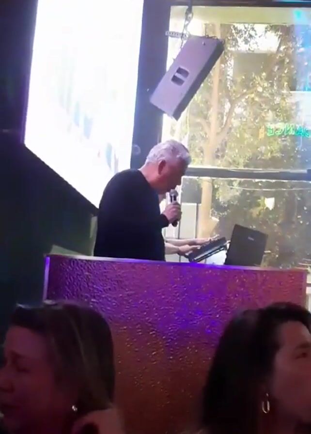 man performing in what looks like a club or bar setting. The man has short grey hair, is wearing a black shirt, and is standing behind a booth or table with a laptop on it. He's holding a microphone and appears to be singing or speaking to the crowd. The booth has a textured, purple, and gold facade. There are at least two women in the foreground, blurred in the shot, who are part of the audience. Behind the performer, there is a window that shows trees and buildings outside, and there is a large screen. A speaker hangs above the performer by chains. The atmosphere appears lively.