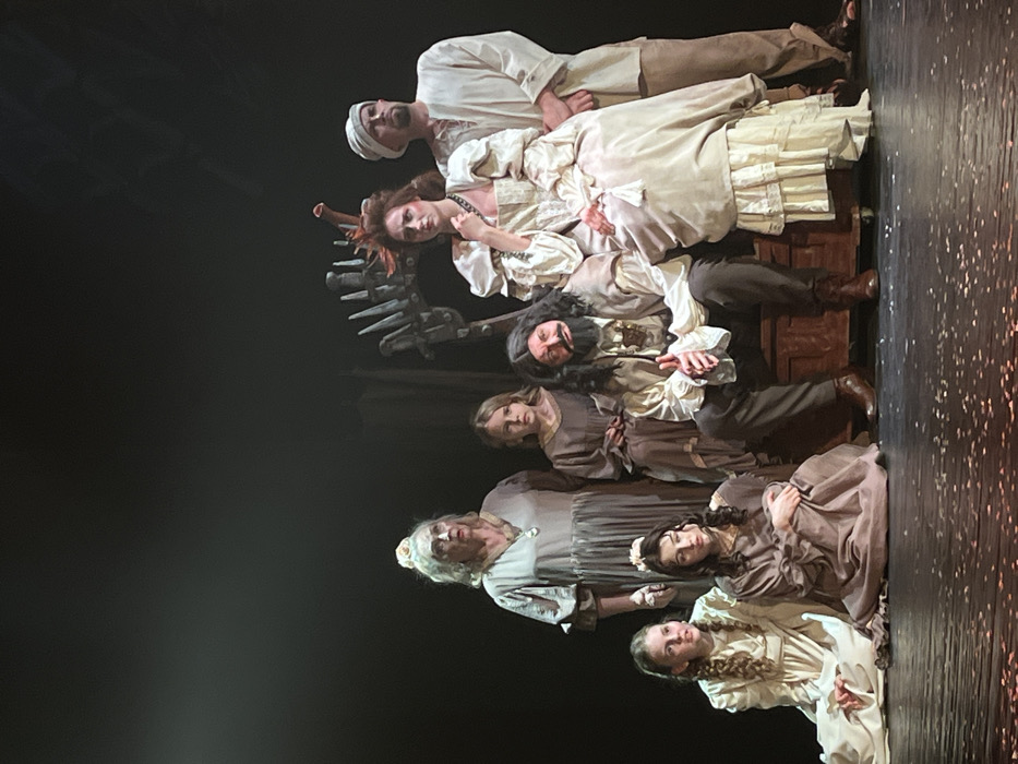 This image captures seven individuals posed on a dimly lit stage, consistent with a theatrical performance at a venue in Novoshakhtinsk, Russia. The background is predominantly dark, with a skeletal-like, dark-colored set piece visible behind the central figures. The stage floor is dark, scattered with light-colored debris. In the foreground, two young females are seated on the floor. On the left, a girl with light hair in a light-colored, long-sleeved dress. Next to her, a young woman with dark hair wears a dark brown, long-sleeved dress, seated with her knees drawn up. Behind them, an older woman with white hair pulled back stands, wearing a long, light grey dress with a pendant, her mouth slightly open and eyes wide. To her immediate right, a young girl with blonde hair stands, wearing a plain dark brown dress. Centered on a dark wooden chest or bench, a man with long dark hair and a full dark beard is seated. He wears a light-colored, ruffled shirt, a darker vest, dark trousers, and brown boots, with his hands clasped. To his right, a woman is also seated on the chest. She has dark hair styled in an elaborate updo with a decorative element and a small, pointed crown-like accessory. She wears a voluminous light-colored gown with ruffled sleeves and a dark necklace, with her left hand near her chin. Standing to the far right, behind the seated woman, is a man wearing a light-colored turban, loose tunic, and trousers. All subjects are looking generally forward.
